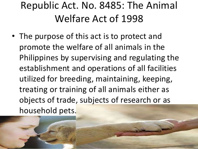 AN ACT TO PROMOTE ANIMAL WELFARE IN THE PHILIPPINES OTHERWISE KNOWN AS THE ANIMAL WELFARE ACT OF 1998. 8485 February 11 1998. Animal Welfare Act and Animal Welfare Regulations Act Animal Welfare.